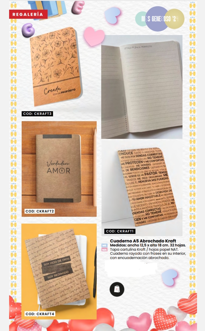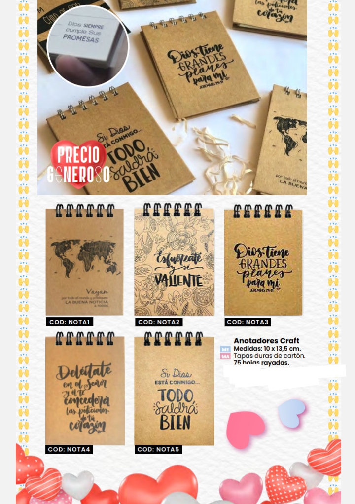 Descripción: 12.5x18 - 32 hojas, tapa cartulina Kraft, hojas papel nat, rayados con frases en su interior